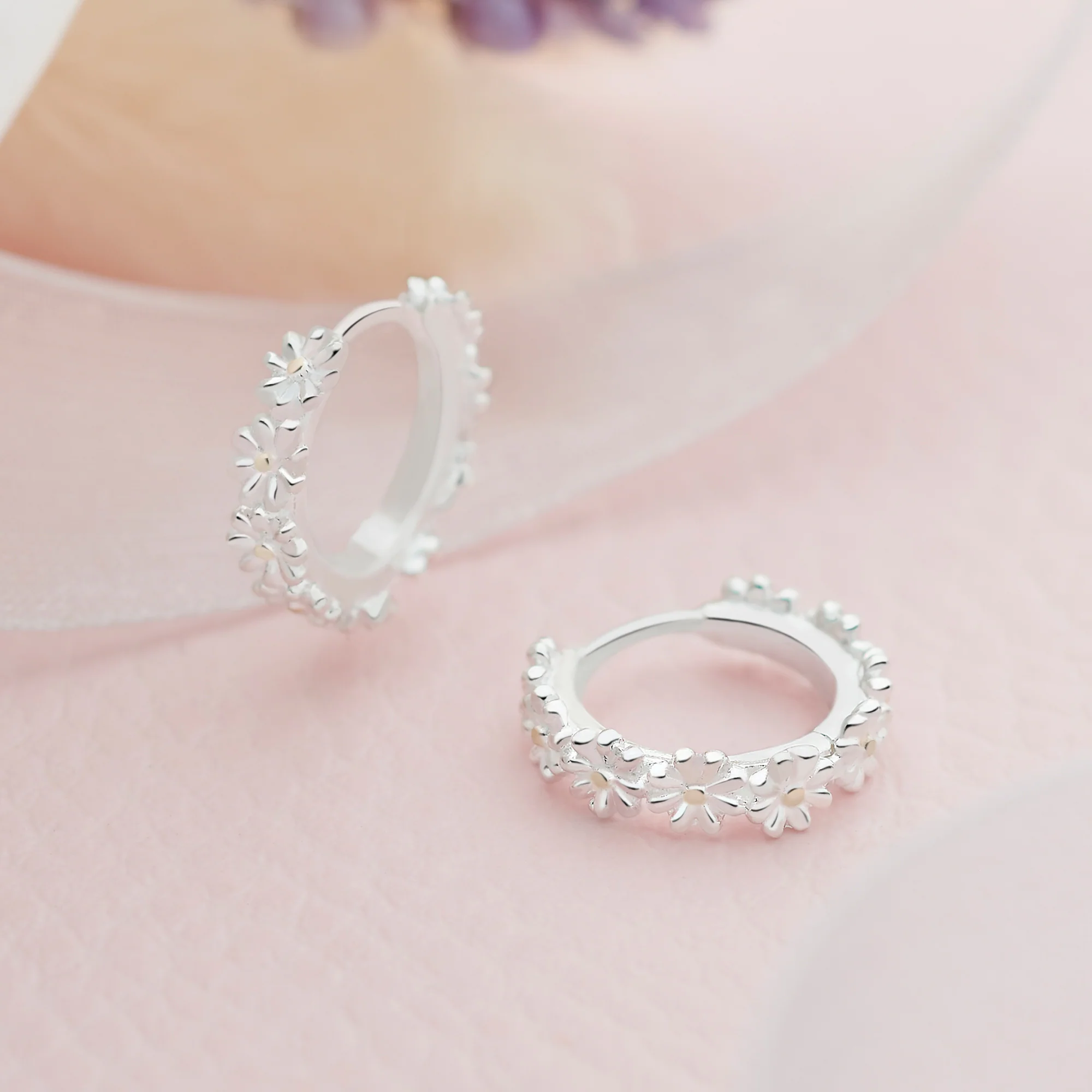 These Daisy Chain Hoop earrings feature stunning hoops made of delicious daisies with gold-plated centres, finished on a hinged setting.