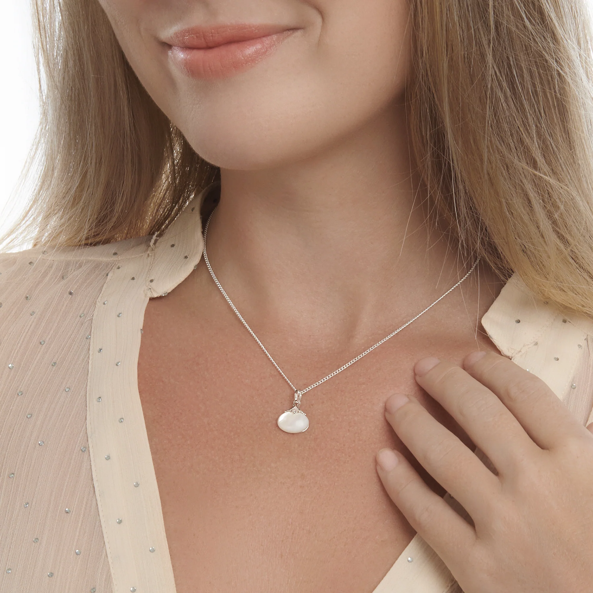 A shimmering cabochon of mother of pearl sits beneath a decorated silver clasp engraved with a delicate heart.