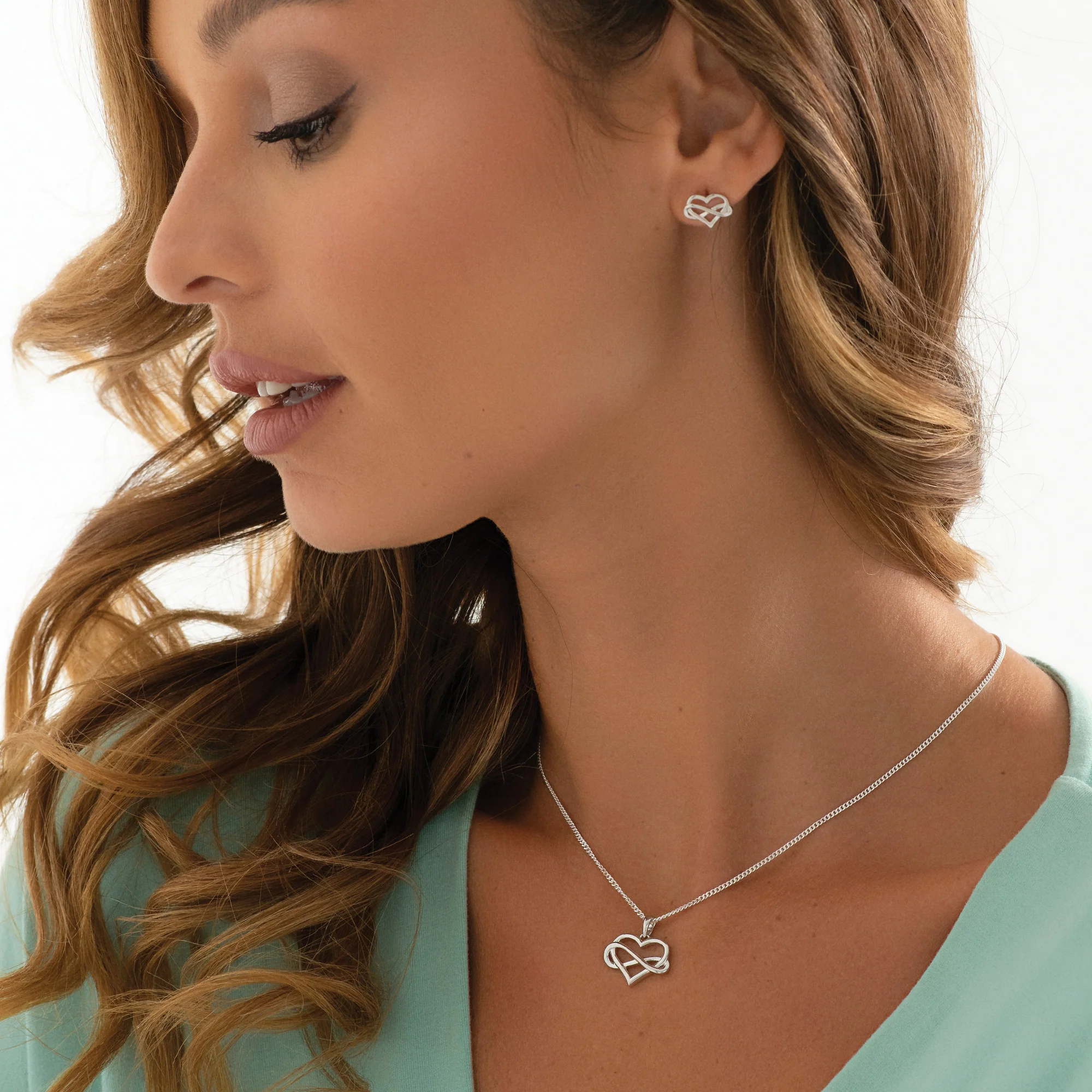 This sleek silver heart is eternally embraced with the symbol of infinity.