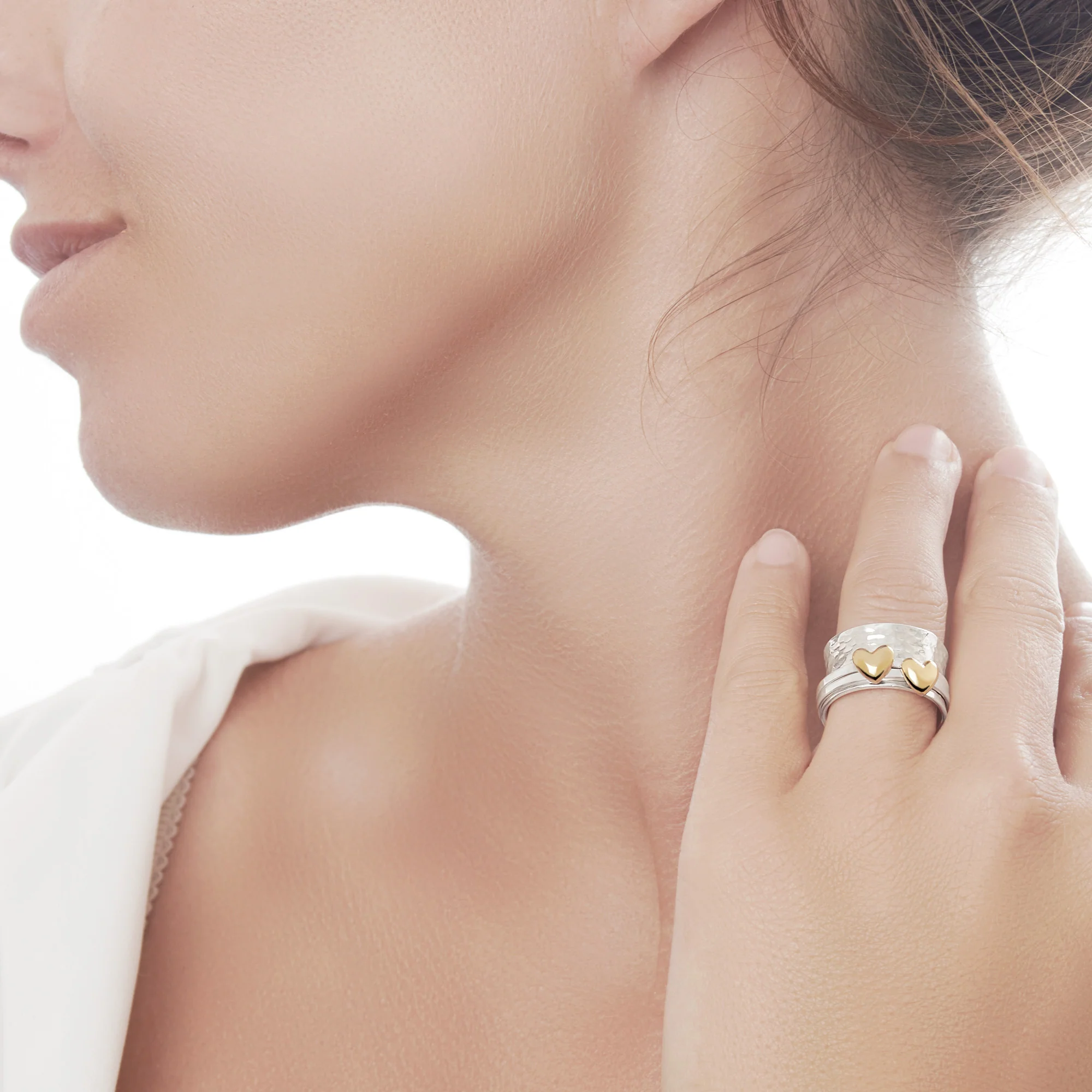 A broad silver cuff with a hammered surface, wrapped with two sleek silver bands each adorned with a cute brass heart - both designed to spin freely!