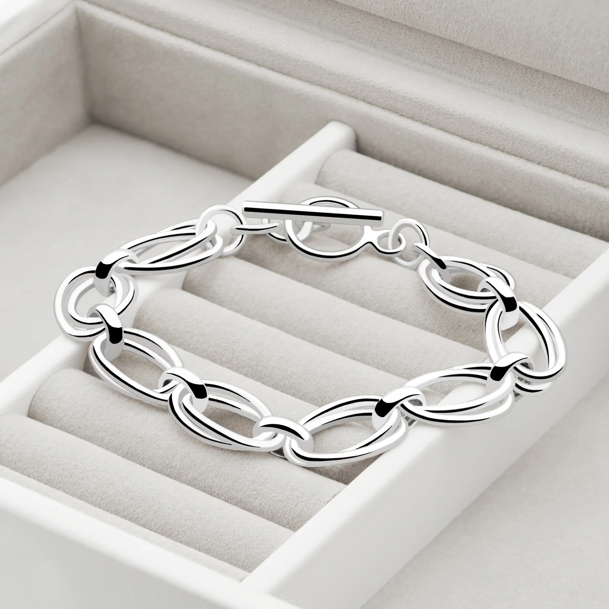Pairing these slender silver ovals gives this feminine piece a bold edge. With modern T-bar clasp, this is made for your working wardrobe.