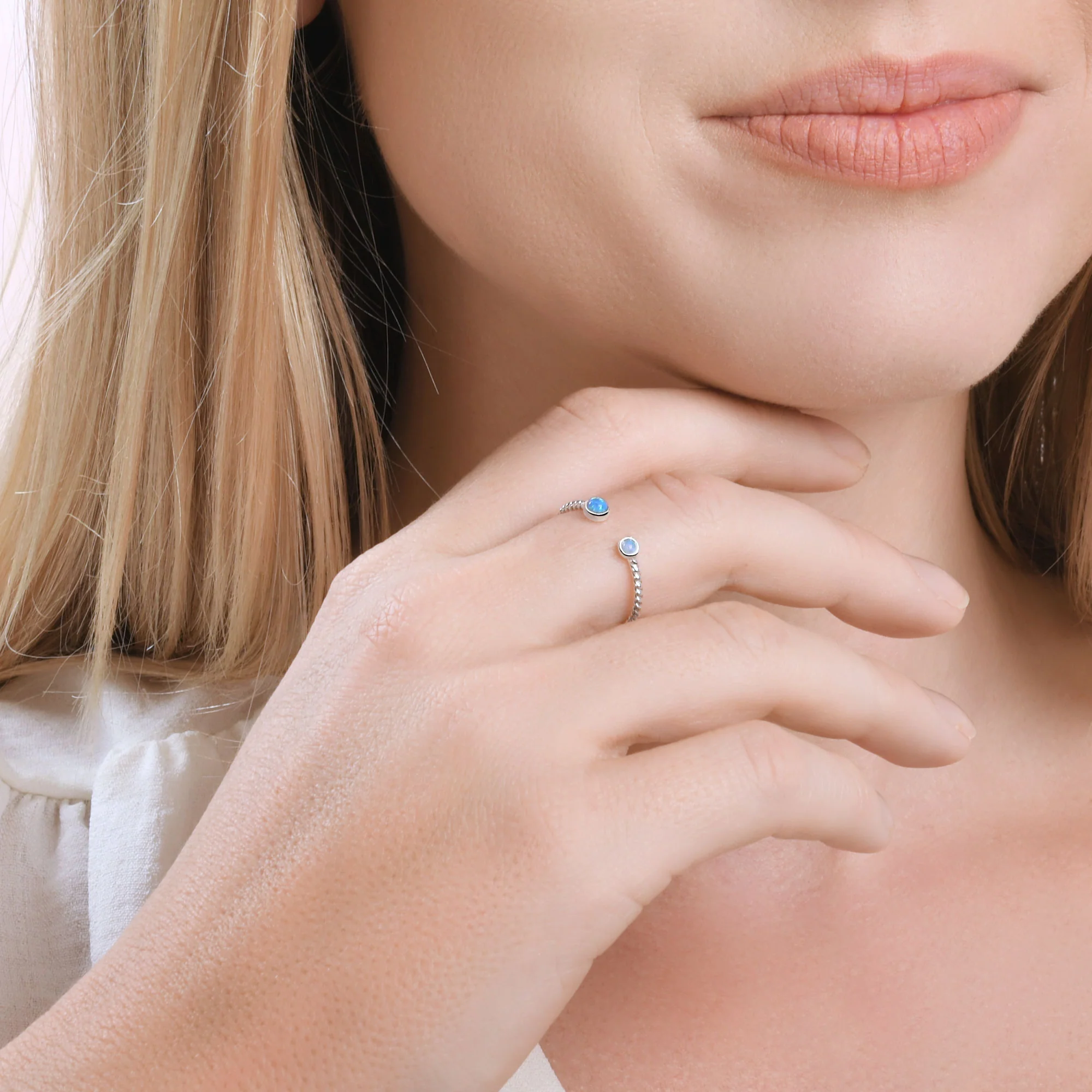 A twisted silver ring finished with synthetic opal bubbles at each end.