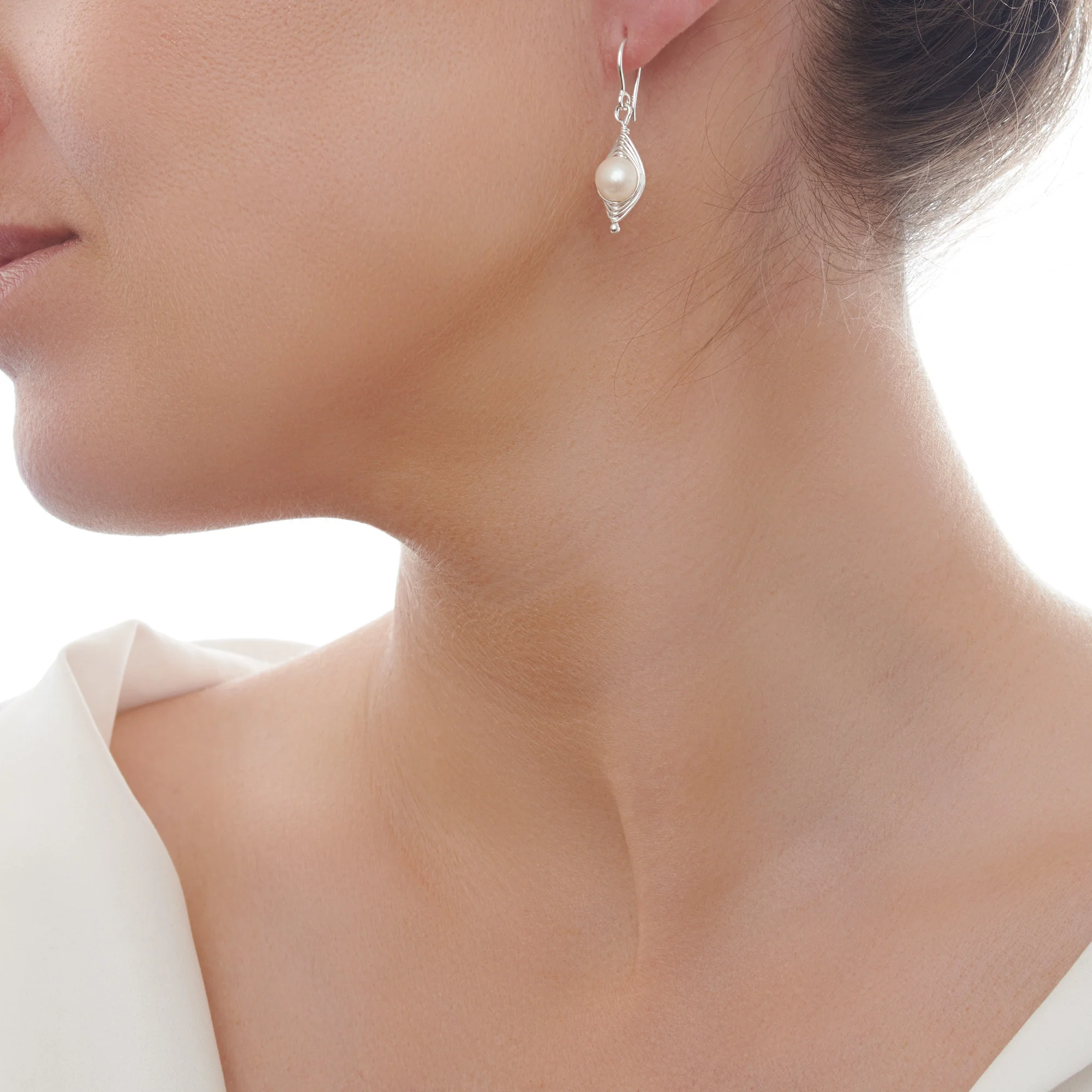 Glowing white freshwater pearls are softly framed in a bed of silver twine. A modern take on the classic pearl earrings.