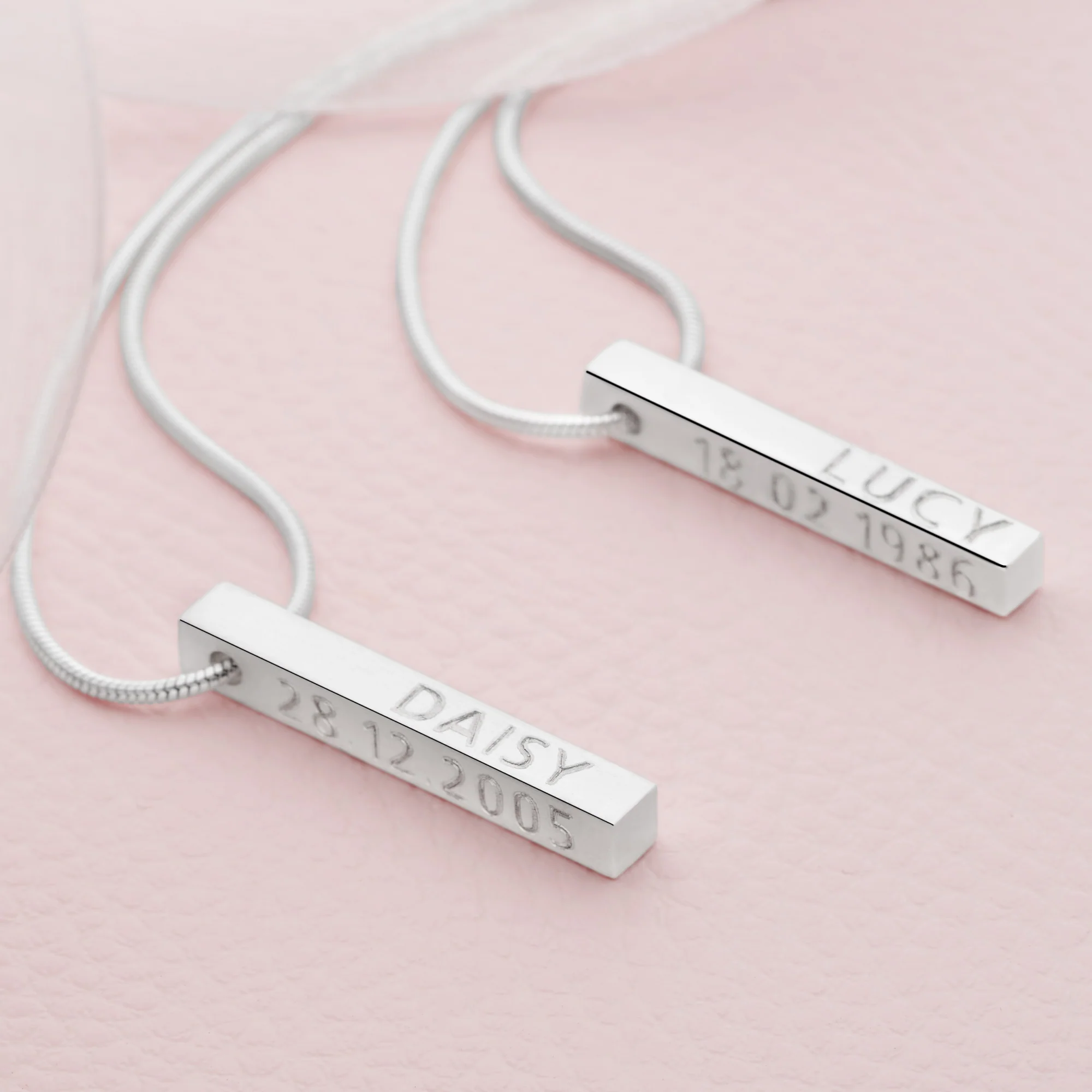 This sterling silver bar pendant in a polished silver finish makes a wonderful gift for those closest to your heart. A classic piece which can be personalised with children's names, newlyweds and the date or time of their special day or anything personal to you. We can only engrave in the font shown (in capital letters) with all numbers. This necklace can be personalised with four personalisations of your choice. Pick the amount of sides you would like personalised, please note that there is an additional £2.00 charge for each side you would like engraved. Please be aware that the left and right personalisations are as if you are looking at the necklace when worn on somebody else.