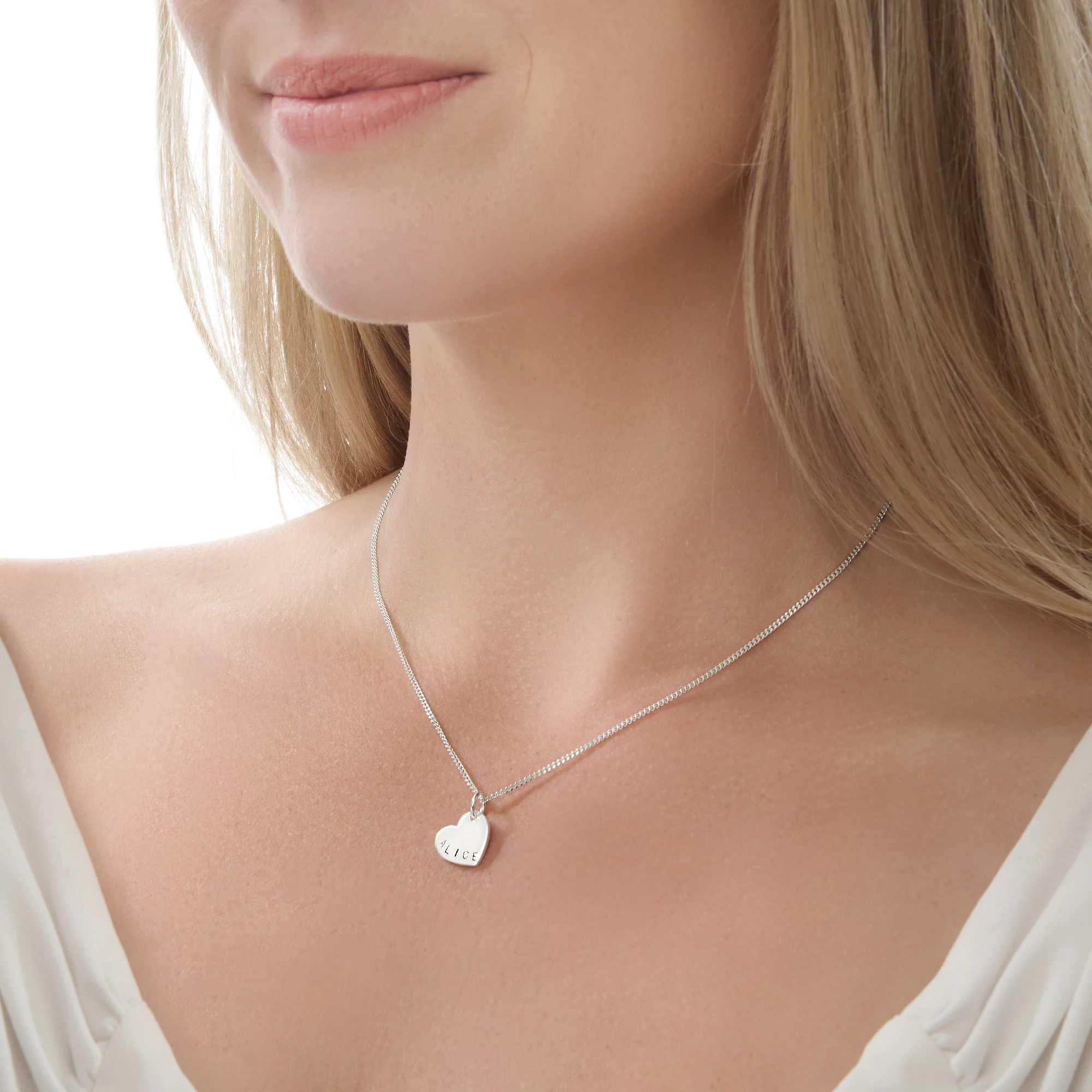 A highly polished plain silver heart which can be personalised with a name (up to 5 characters long) of your choice.