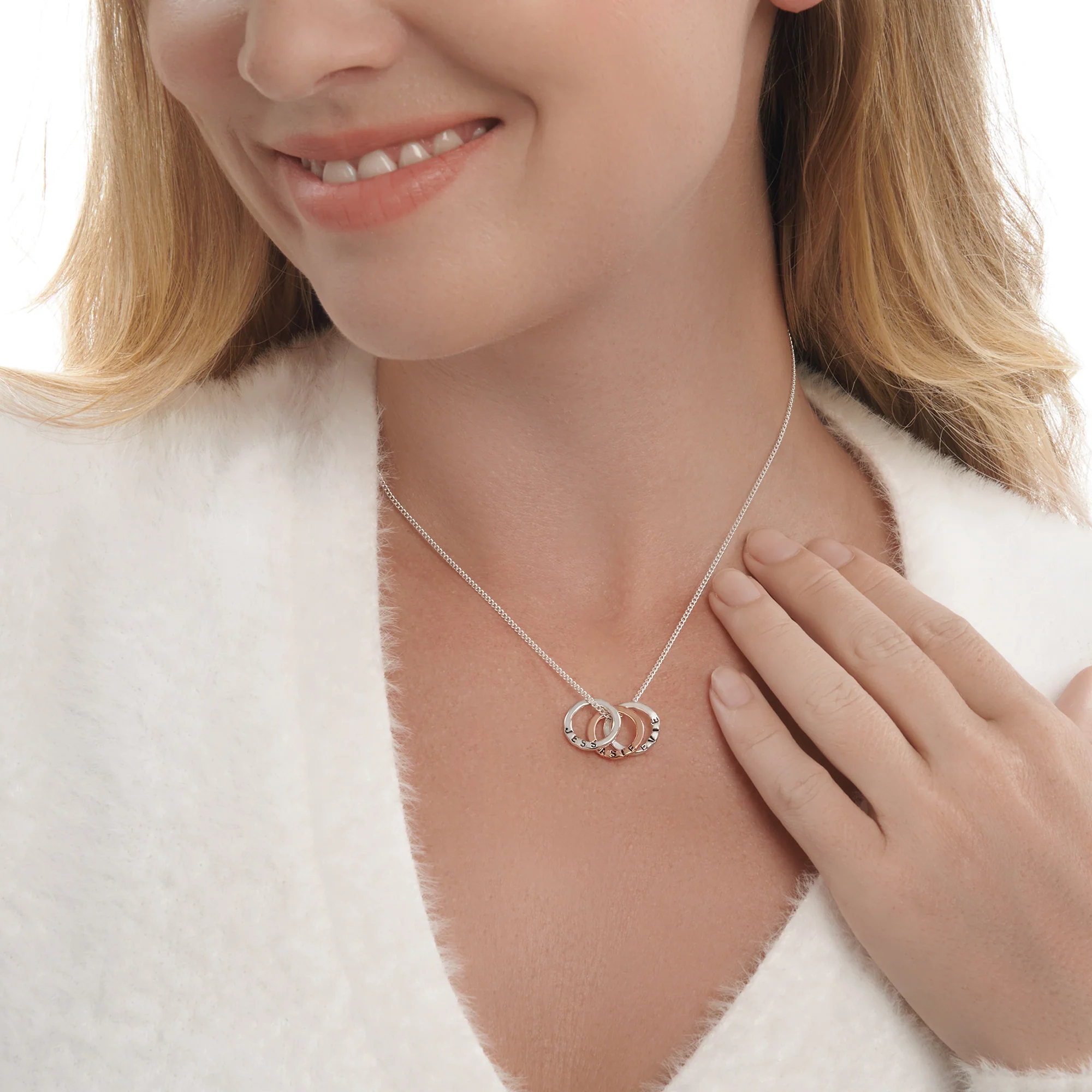 A beautiful pendant with a gently hammered surface which you can personalise. Choose up to 6 rings to add to your chain. A classic piece which makes a wonderful gift and can be personalised with children's names, newlyweds and the date of their special day or anything personal to you. We can only stamp in the font shown with the Roman alphabet and all numbers. The text is hand stamped letter by letter. This creates a quirky uneven finish rather than a perfect machine straight finish. We do this as we feel it adds to the individual charm of each piece. No two pieces will be alike.
