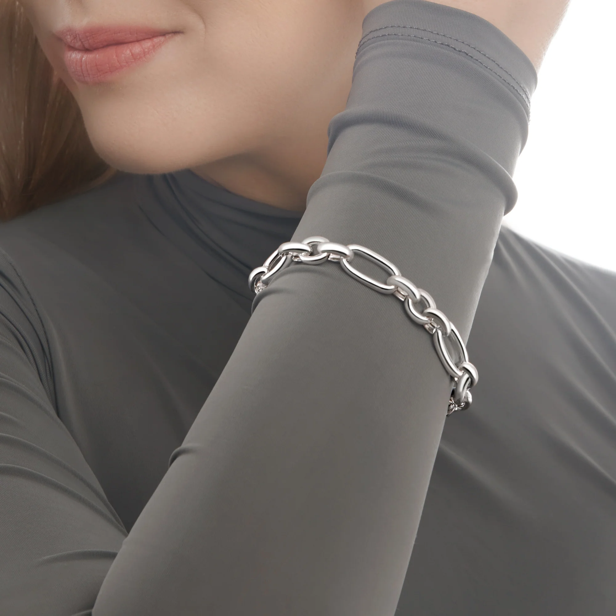 These elongated links of gleaming silver pleasantly highlight your wrist. Large enough to be noticed alone or make a bold statement and stack with other bracelets in your collection.